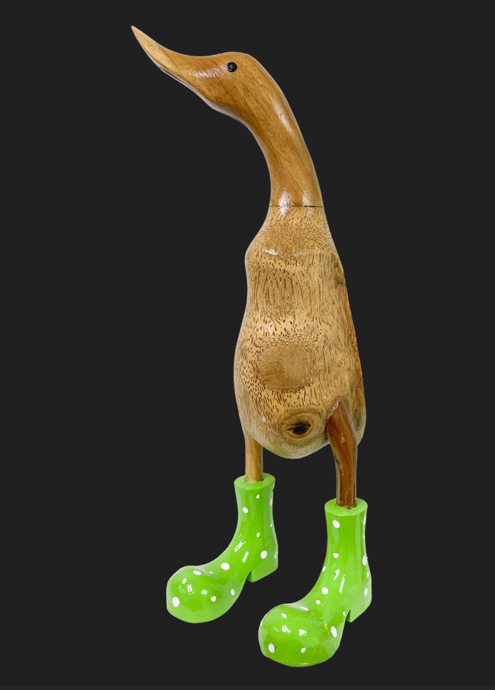 Fair Trade Bamboo Root Duck with quirky coloured wellies. These duck come wearing wonderful wooden colourful spotty or flowery wellies.